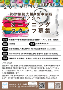 目次 就労継続支援B型 イアンベ開所クルー募集スタッフも大募集!就労継続支援B型 イアンベ開所 来春開所にむけて鋭意活動中! イアンベでは、クルー(利用者)とスタッフを募集しています。 クルー募集 発達障がいの方で、お仕 […]