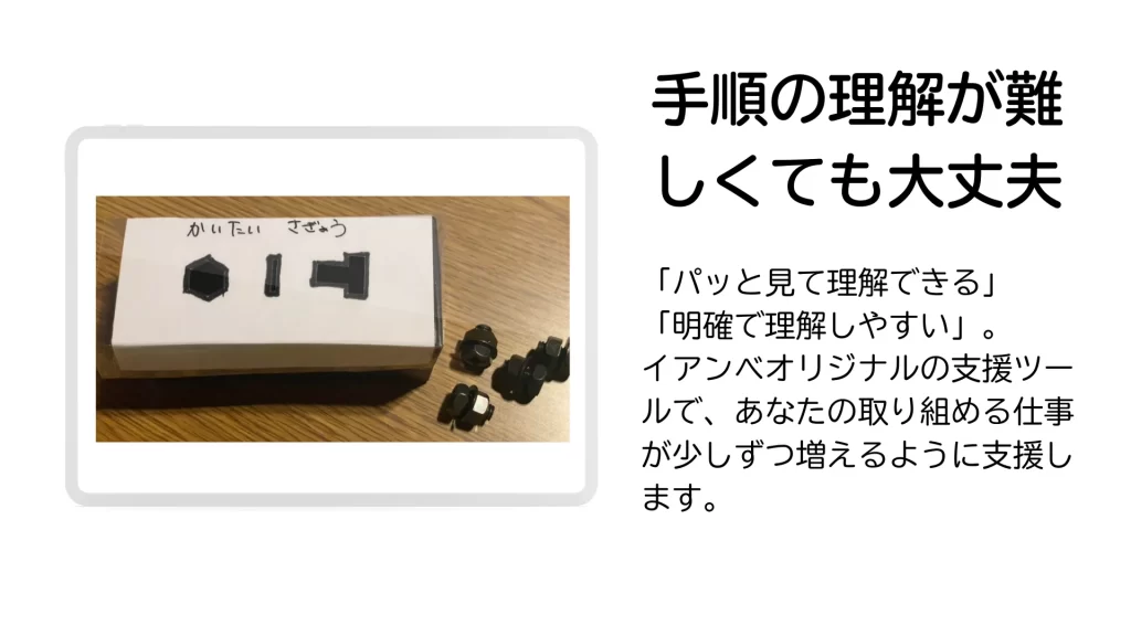 発達障害者専門施設にて約20年経験を積んだ代表が、あなたの障がい特性・得意に合わせてカスタマイズした支援ツールを提供します。 「パッと見て理解できる」「明確で理解しやすい」支援ツールであなたの作業を支援します。