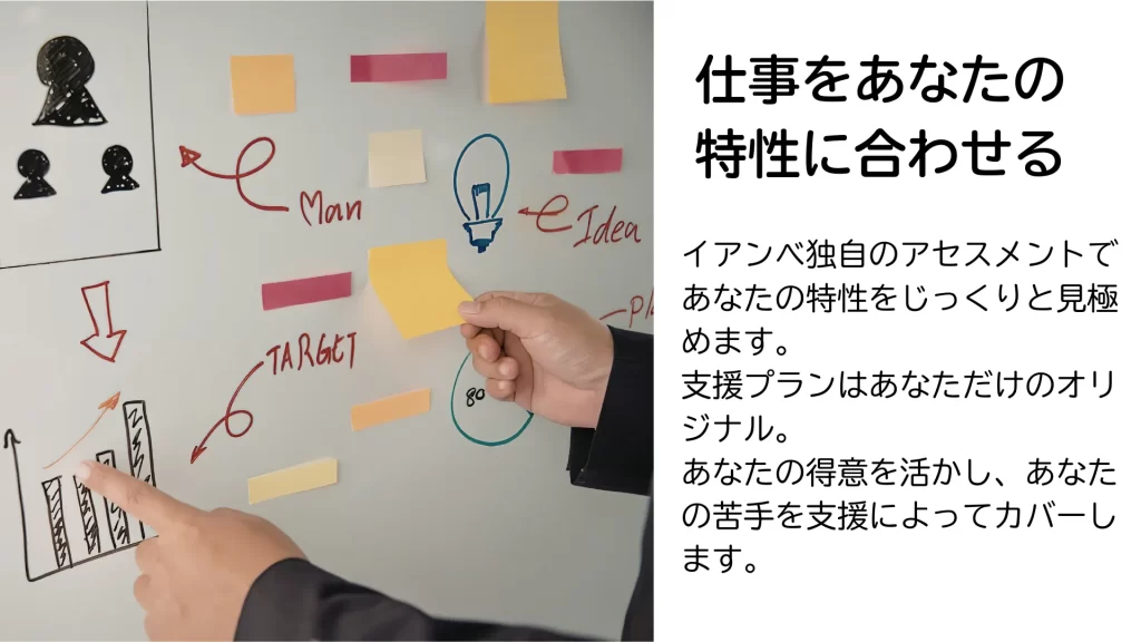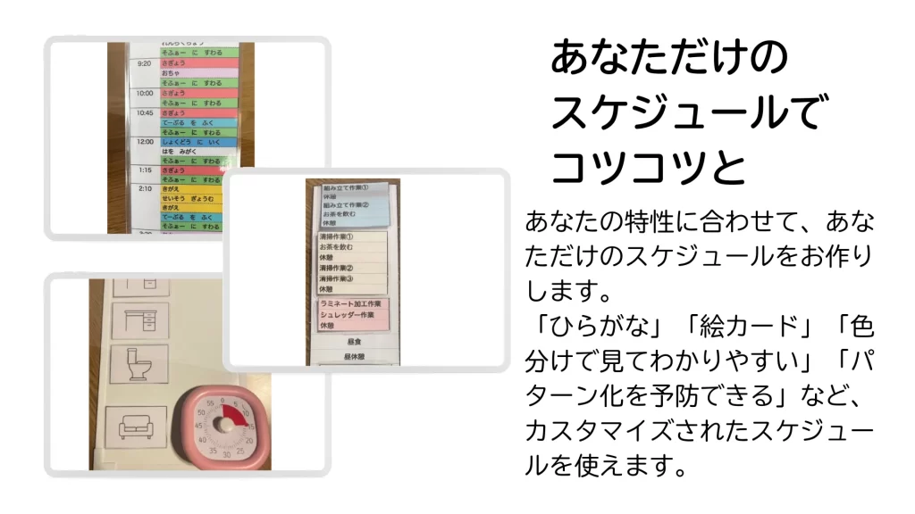 イアンべでは、必要に応じてあなたの障がい特性・得意に合わせた個別のスケジュールを提供します。