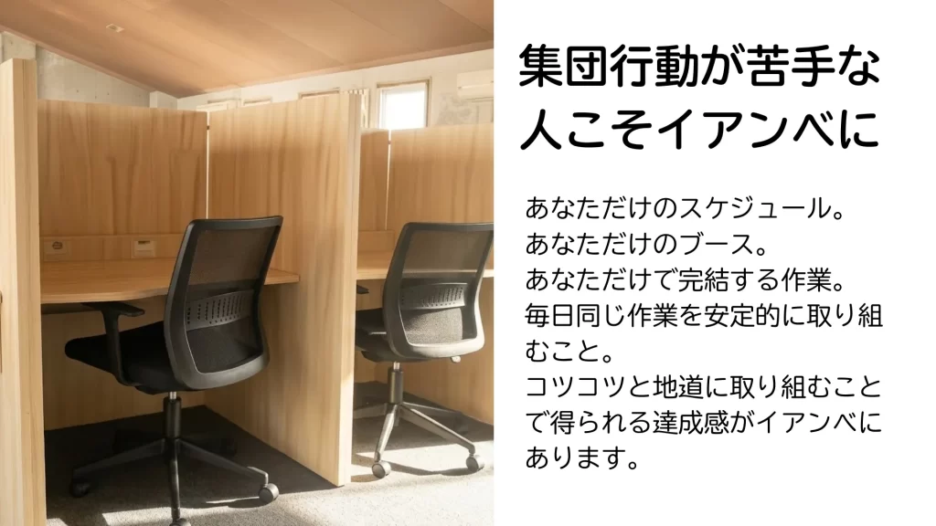 これらに1つでも当てはまる方は、イアンべにぜひいらしてください。 自分だけのスケジュールで作業するので「待ち時間」「他の人に合わせる」ことがありません。