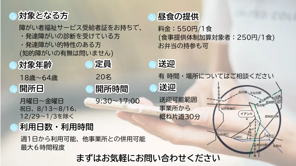 イアンべは、仙台初の発達障がい者支援に特化した就労継続支援B型事業所です。