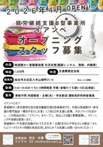 目次 就労継続支援B型 イアンベ開所クルー募集スタッフも大募集!就労継続支援B型 イアンベ開所 来春開所にむけて鋭意活動中! イアンベでは、クルー(利用者)とスタッフを募集しています。 クルー募集 発達障がいの方で、お仕 […]